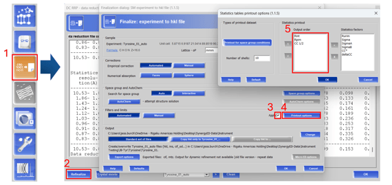 By default, CrysAlisPro does not output CC1/2 to the final statistics vs. resolution tables. To add it to all future datasets collected on your system, follow the procedure outlined in Figure 1 using the online version of CrysAlisPro on the data collection computer. Open the program options by clicking on program name (1.1), edit options (1.2), and select the check box (1.3) to globally update the printout options (1.4) to include statistics outside the default settings. The statistics placed in the output order box (1.5) will be printed in their respective order after data reduction.