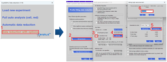 After evaluating the outcome of automated processing from CrysAlisPro, you may find that the default high-resolution limit of 0.8 Å is not ideal for your sample. If you need to include higher resolution data, then you need to re-integrate the data. This can be done by selecting the “start/stop” button and initiating data reduction with options (3.1). Click next twice to find the “edit special pars” option (3.2) and ensure that resolution limits are checked (3.3). Select edit limits (3.4) and adjust the high limit (3.5) to your desired value (3.6). Select “OK” on all windows and perform your integration and scaling.